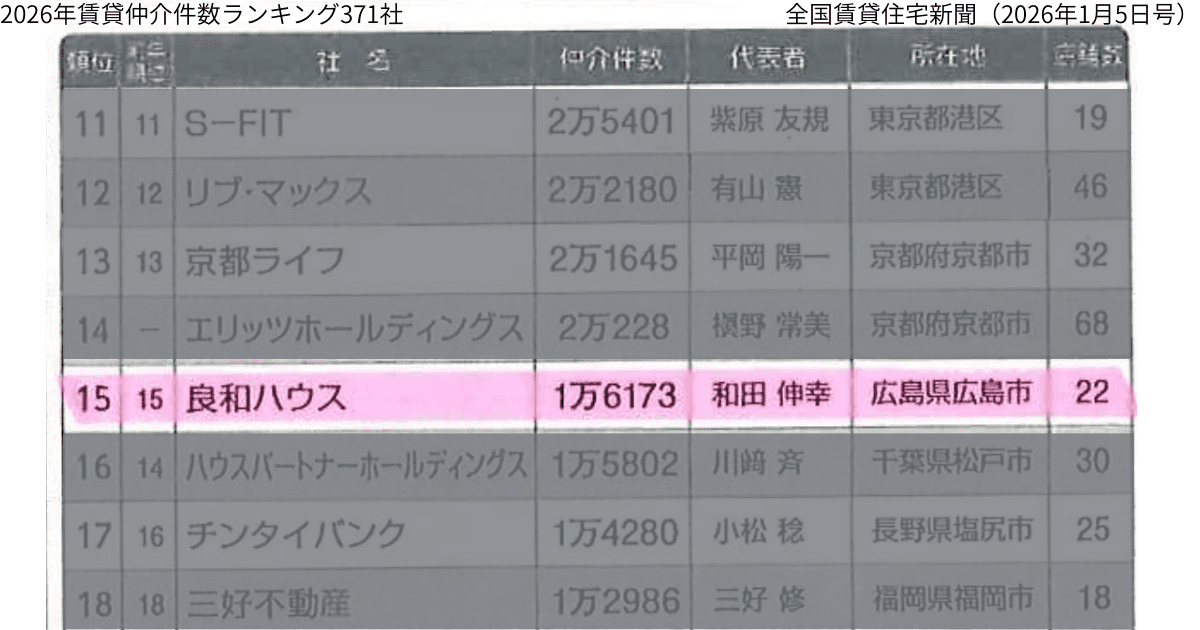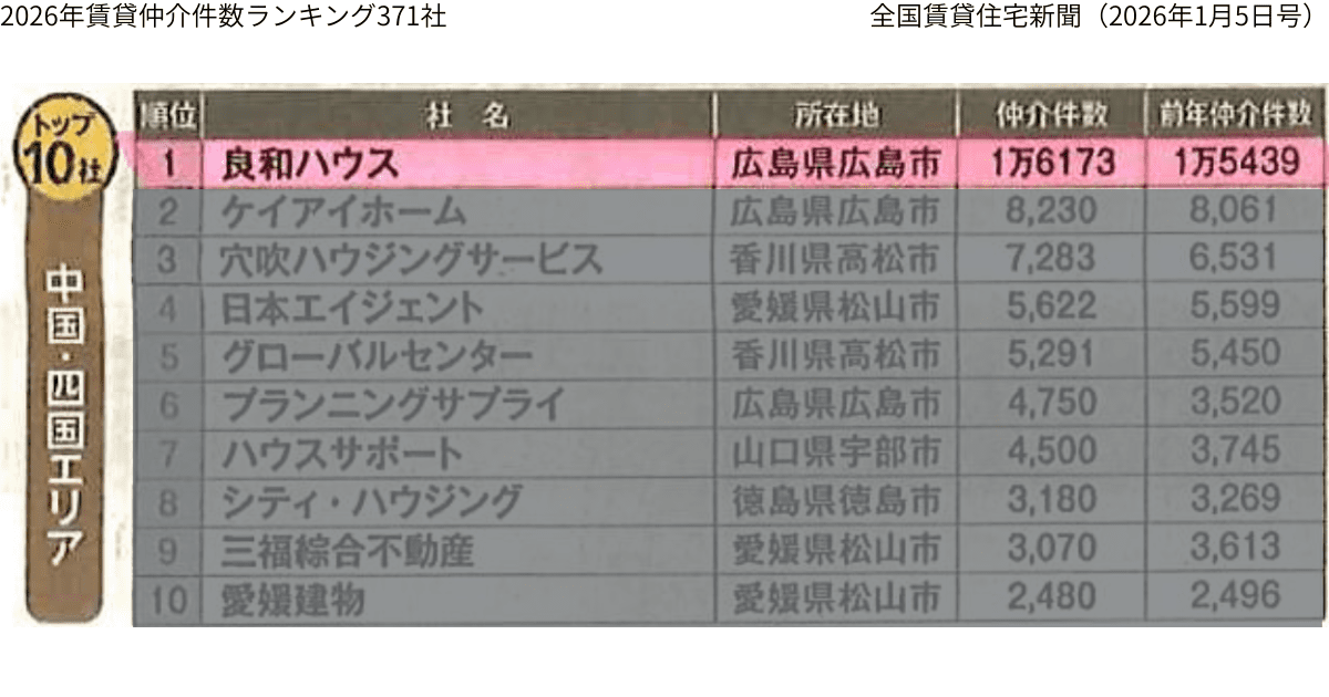 『2025年賃貸仲介件数ランキング371社』にて、良和ハウスは全国順位では15位、中四国エリアでは1位